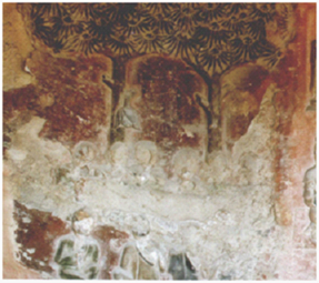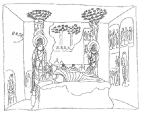 卧佛窟“诸天供养”浮雕画面构图:娑罗双树下,金棺居中,摩耶夫人和九位弟子分前后二排围金棺而坐,树枝上挂一莲蕾。娑罗树枝上的莲蕾当为诸天所散之天华。