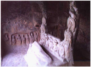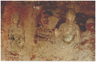 卧佛窟“为母说法”浮雕画面构图:释迦牟尼居中而座,身后一弟子,应为阿难,摩耶夫人胡跪面向释迦。