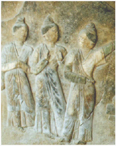 在雕刻技法上,“摩耶奔丧图”无论是山石衬景还是人物衣裙都简洁明快,圆熟中透着犀利,浮雕画面层次分明,透视效果较强,从而营造出一个深远广阔的空间。