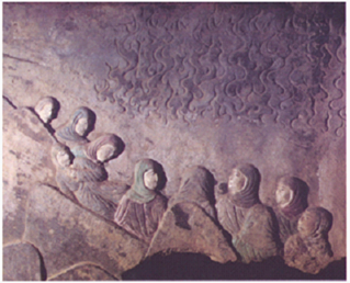 四川广元千佛崖卧佛窟浮雕局部“诸天供养”