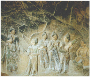 关于这件浮雕图的含义。学术界意见似乎并不统一。有多种诠释。李已生主编认为她们是出山朝佛的妇女。鲍训庸认为她们大约是当地有身份的贵族妇女赶去为释迦送葬的情节。郑炳林、雷玉华等认为画面左侧是一男子游戏坐,束螺状发髻,袒裸上身,下着宽大长裤,一手抚座,一手抚膝。未提到是此男子是摩耶夫人。吴新认为此图应是“奔走相告”,表现的是六位头束锥形高髻、身著交领窄袖长衫女弟子,在闻佛涅磐后,奔走相告的场景。