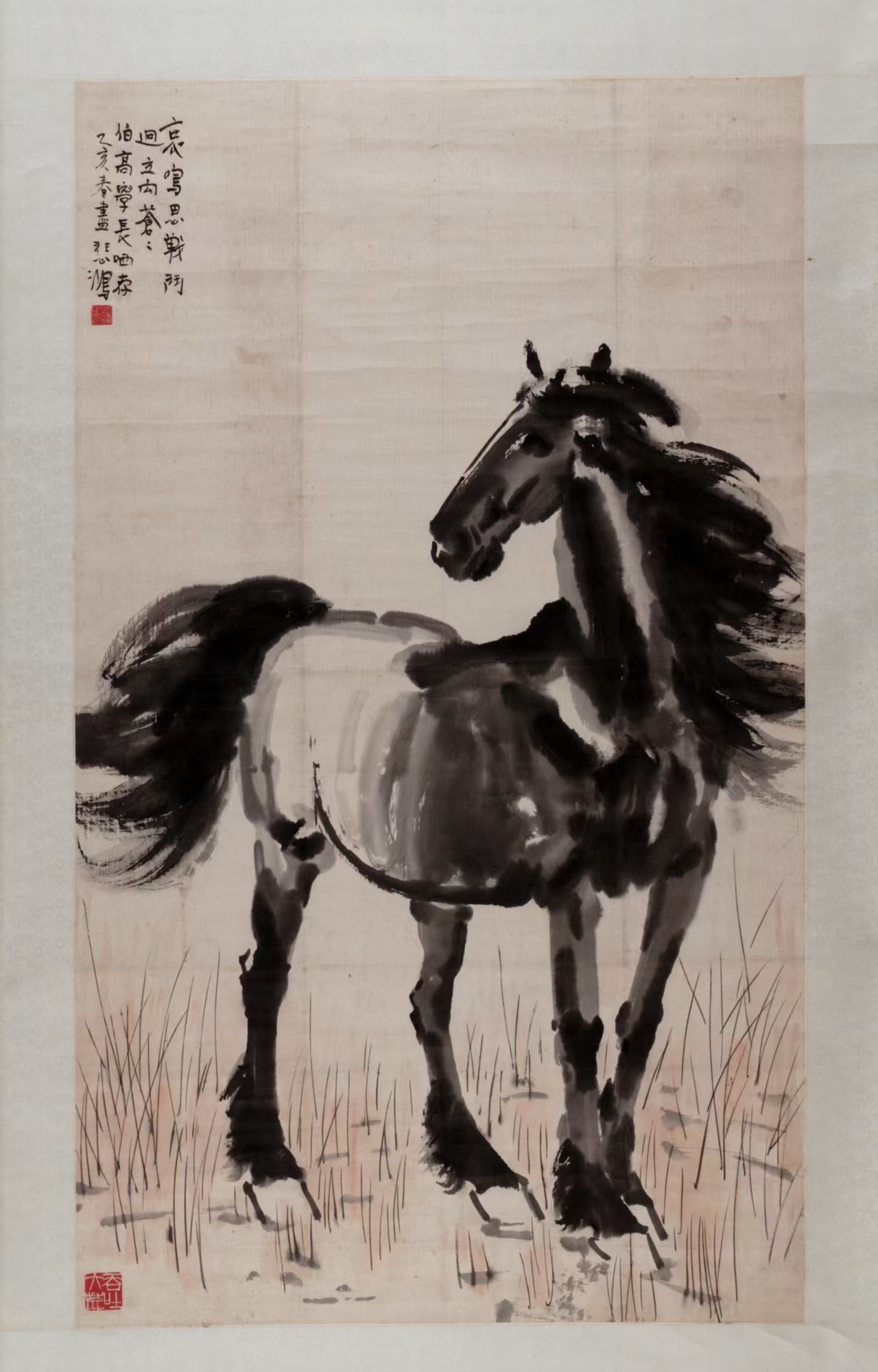对大多数现代人而言,最熟悉的以马为主题的画作,当属徐悲鸿的系列骏马图。画中之马姿态各异,或奔腾、或挺立、或回首、或俯身,气宇不凡、气势飞扬,是现代中国画的标志性成就之一。