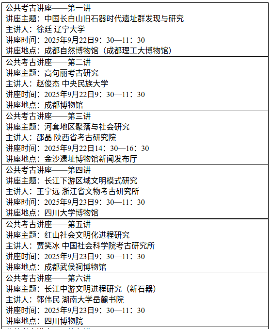 作为全国考古工作会的配套活动之一,“考古中国”重大项目成果系列讲座将于9月22日至28日在成都市多个场馆举行,相关讲座预告已在省文物局官方网站和有关博物馆公众号等渠道推出。(局考古处)