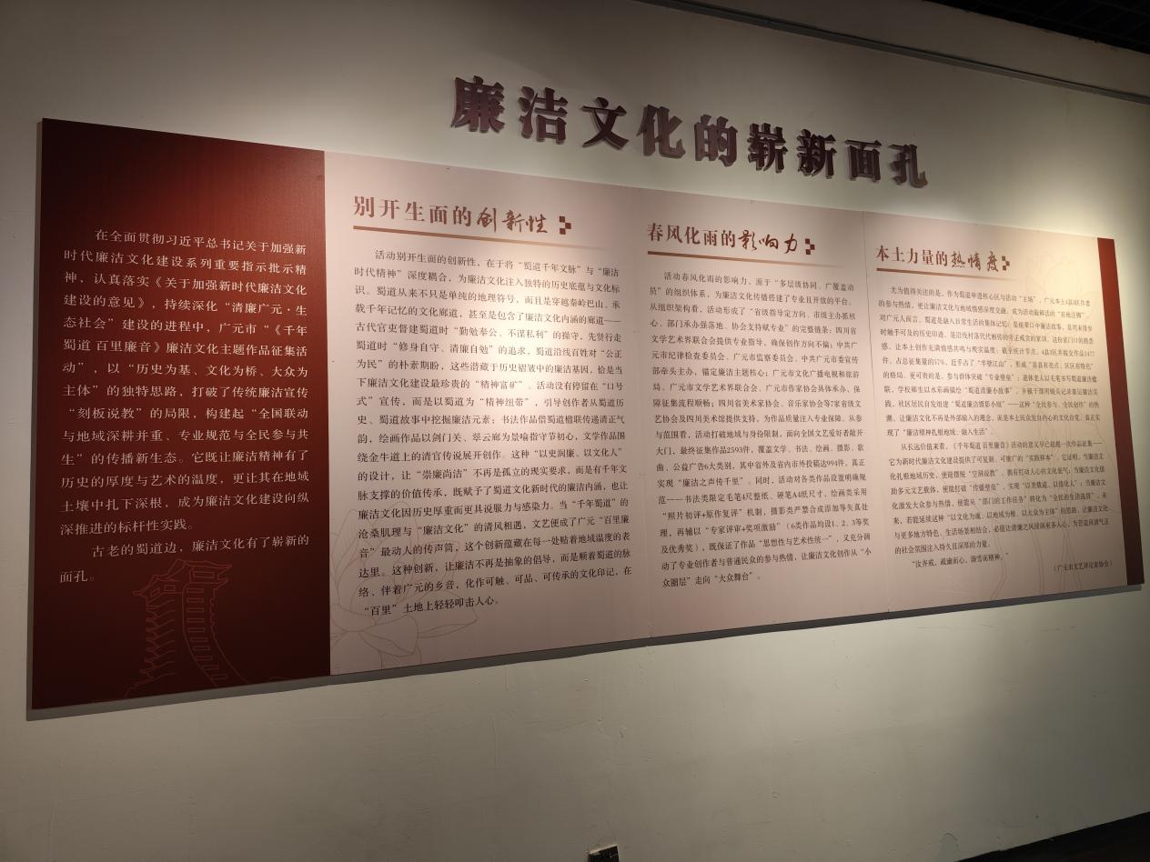 为全面贯彻习近平总书记关于加强新时代廉洁文化建设系列重要指示批示精神,持续深化“清廉广元·生态社会”建设,进一步树立清廉价值理念,促进廉洁文化与地方文化的有机融合,此次展览自6月30日起面向全国公开征集书法、绘画、摄影、文学、歌曲、公益广告6类廉洁文化作品,得到了全国各地文艺工作者、爱好者的积极响应,共收到投稿作品2593件。经过评审专家两轮评选,共展出优秀作品121件(含特邀作品25件)。作品融思想性和艺术性于一体,深入挖掘和展示蜀道文化中的廉洁元素,主题鲜明、立意新颖,内容丰富、形式多样,于笔墨晕染间、丹青描绘处、光影交错时,将蜀道文化、历史名人文化和廉洁文化等融合结合,以书法、绘画、摄影、公益广告等群众喜闻乐见的文艺形式为载体,用艺术视角切入廉洁主题,以润物无声的方式发挥文艺作品特有的感染力、浸润力、穿透力,为营造以廉为荣、以贪为耻的良好社会氛围发挥艺术力量,也为广大人民群众献上一场品类丰富的文化艺术盛宴。