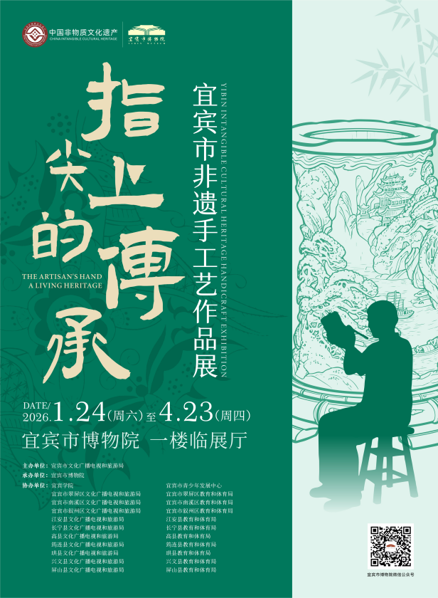 展览简介:展览由宜宾市文化广播电视和旅游局主办,宜宾市博物院承办。本次展览精心遴选100余件/组非遗传承人的匠心之作和100余件各县(区)学校的优秀手工艺品,旨在全方位展示宜宾特色文化资源,带领观众沉浸式领略传统与现代交融的非遗魅力,并为大家展示现代中小学全新的美育理念。