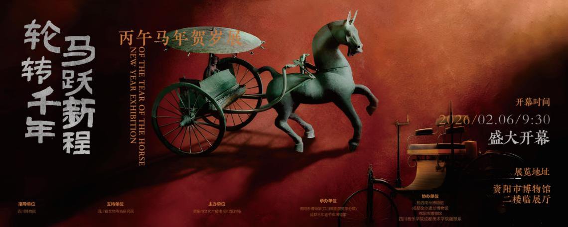 展览简介:岁序更新,骐骥呈祥。为贺2026丙午马年新春,资阳市博物馆、成都三和老爷车博物馆精心策划,联合推出《轮转千年·马跃新程——丙午马年贺岁展》。展览以车马为线,分为“载驰载驱——古代车舆与礼制秩序”“引擎纪元——动力革命与东方启程”“车马贺岁”三大版块,带领观众穿越古今,对话中西,重温礼序乾坤的造物智慧,感受机械革命的澎湃动力,擘画智慧出行的中国画卷,彰显时代速度与文化自信。展出展品80余件,包括四川资阳铜车马、贵州兴义铜车马、人类历史上第一台汽车奔驰1号、标志汽车规模化量产的福特T型汽车、新中国早期生产的国宾轿车红旗CA772、徐悲鸿《画马图轴》等重磅车马主题展品,让观众在丰富的展品中感受蓬勃向上、奔腾不息的车马精神。